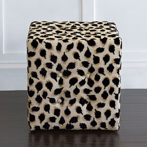 The Black Ocelot Cube Ottoman is a bold, compact accent piece, upholstered in luxury animal print fabric with hand-tufted fabric-covered buttons. Its striking black ocelot pattern adds an untamed elegance to any space.