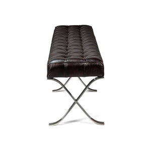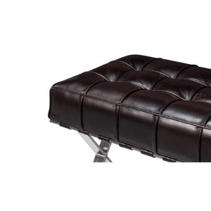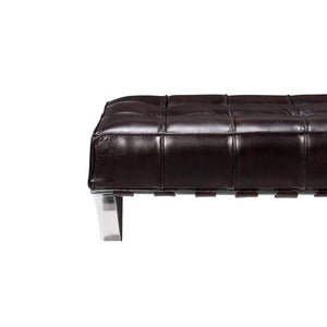Brown Mid Century Modern Leather Bench, this sleek and modern bench combines luxury with a minimalist design, perfect for adding a touch of elegance to any interior space. The bench features a high-quality, deep brown tufted leather cushion that exudes comfort and sophistication. The rectangular form is supported by a polished stainless steel frame that provides a durable and stable base while contributing to the bench's chic and contemporary look.