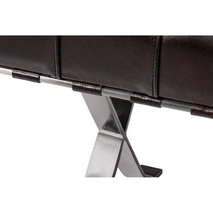 The leather's rich brown tone will complement a variety of color schemes, making it a versatile choice for your living room, hallway, or at the foot of a bed. The steel frame, distinguished by its X-shaped legs, is not just a design element but also reinforces the bench's robustness.