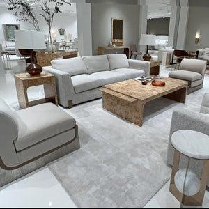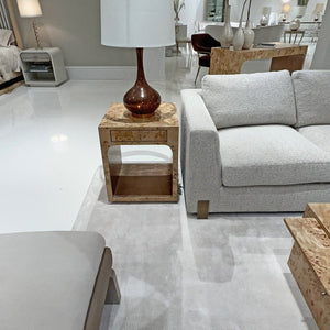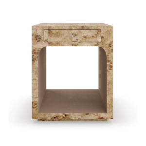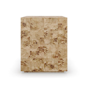 Burl Wood Side Table. Crafted from exotic mappa burl veneers, intricately pieced to showcase its highly figured, swirling grain and interplay of light and dark tones.