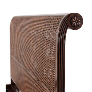 A Regency style Anglo-Indian bed. With a modestly scrolled headboard and footboard with caned panels. Reeded rails, flowerhead carved roundels, scroll carvings and turned tapered legs add authenticity and charm.