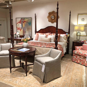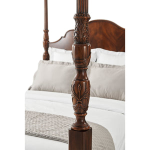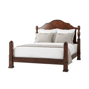 A finely carved mahogany and figured mahogany rice Queen bed, the serpentine arched and molded edge headboard flanked by acanthus leaf and rice carved baluster turned posts with urn finials, the figured mahogany rails with brass rosettes to the posts. Inspired by an 18th-century American original.