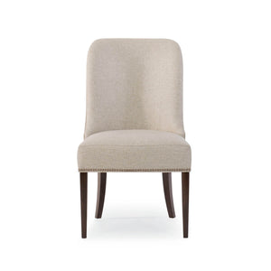 Classic Art Deco Dining Chair, clean, classic lines, fully upholstered in a neutral brushed fabric, with tapered sabre legs are finished in Bourbon Glaze. With its band of brass nails at the base, these chairs pair well with modern and transitional pieces.