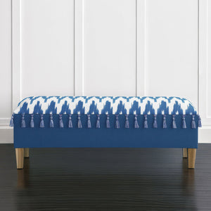 Enhance your space with the Coastal Blue Upholstered Storage Bench, a perfect blend of artistry and function. The Sombori Cerulean ikat-patterned cushion adds vibrancy, while handcrafted tassels and an Amador Ocean base provide a refined contrast. Resting on natural wood tapered legs, this bench exudes sophistication.