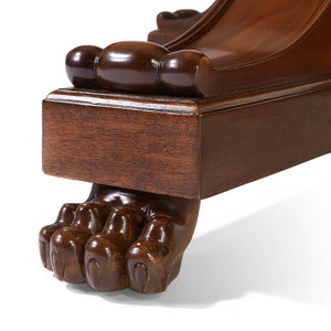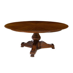 French Empire Style extension dining table with carved pedestal, inset fold-out leaves, scrolled tri-base, and carved claw feet, with radiating veneer top. The table seats up to nine people when open.