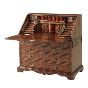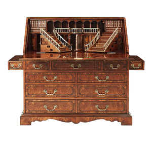 The staircase gallery provides an elegant touch, and the short frieze drawer and flanking dummy drawers are a lovely detail. The bureau also features two short and two long drawers, as well as additional drawers on the sides, for ample storage. The sturdy bracket feet ensure stability, and the beautiful flame mahogany wood adds a touch of warmth and richness to any room.
