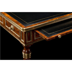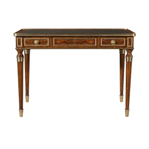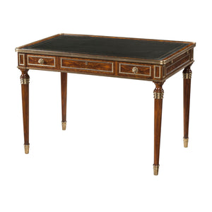 A mahogany and brass mounted bureau plat desk, with a leather inset writing surface and three frieze drawers, on turned legs French. The original Louis XVI.