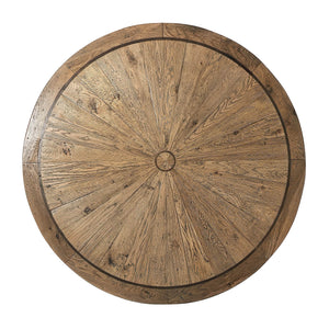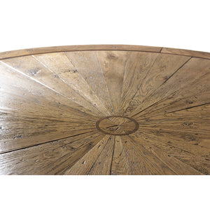 A Modern rustic round dining table with beveled edge and oak parquetry top and a walnut line inlays. Finished in our Echo Oak finish and raised on a vintage style metal parabolic arch form base.