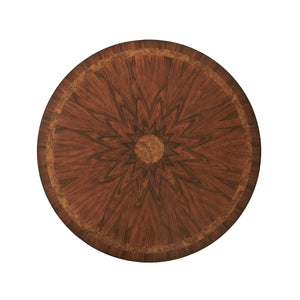 The table's surface is beautifully crafted from Morado wood, known for its deep hues and fine grain, complemented by Pollard oak banding that adds a striking visual contrast. The circular design measures 48 inches in width and depth, providing ample space for dining, socializing, or displaying your favorite decor.