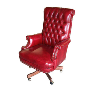 A Fine English style Tufted Executive Office Chair with tufted back and seat, a rolled top to the tufted back, with scrolled arms and padded seat (which can also be tufted). The large office chair is smartly appointed with elegant lines, brass nailheads to frame the upholstery and is supported by a hydraulic lift base on caster feet.