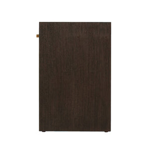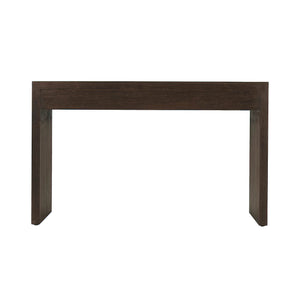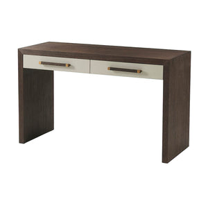Simply Modern Writing Table. An elegant modern writing table with two singular leather-wrapped drawers, our Cardamon finish on the veneered frame (and handles) with panel end supports and brushed brass finish accents.