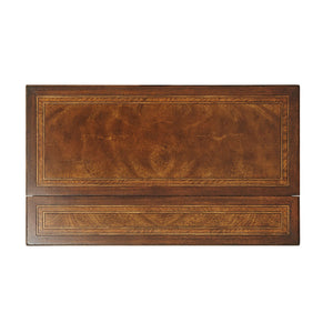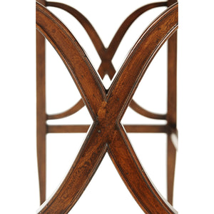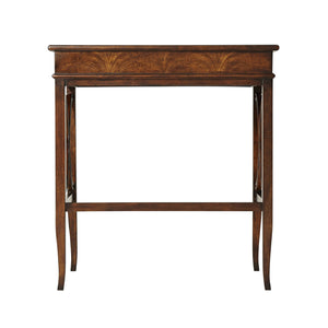 A Campaign style mahogany campaign desk, the circular crossbanded molded edge top hinged and folding open to reveal an interior with pigeon holes and a leather writing surface above square tapering and splayed legs joined by wavy 'X' stretcher to each side. Inspired by a 20th-century French original.