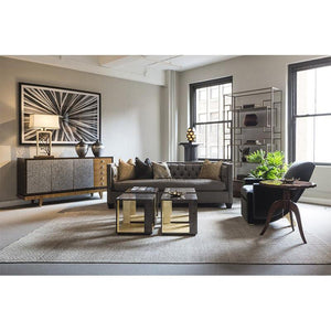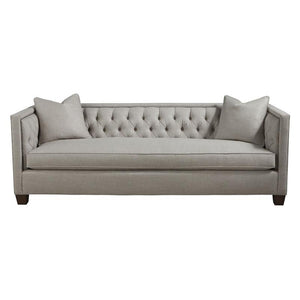 A Transitional upholstered sofa, the tufted inside back within an upholstered frame with nail trim details, the bench cushion seat with two Canadian down throw pillows between square high track arms, on square tapering block feet.