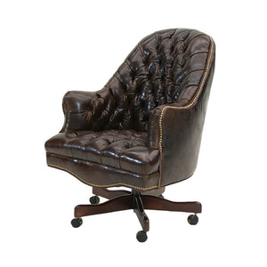 A Fine English style Tufted Barrel Back Desk Chair with tufted back and seat, an arched backrest with padded and upholstered arms, a shaped front rail with brass nailhead finishing details, a hydraulic lift to raise the seat and a mahogany polished five-legged base on casters.
