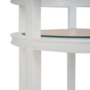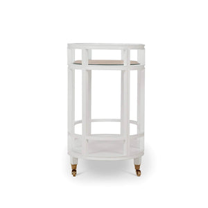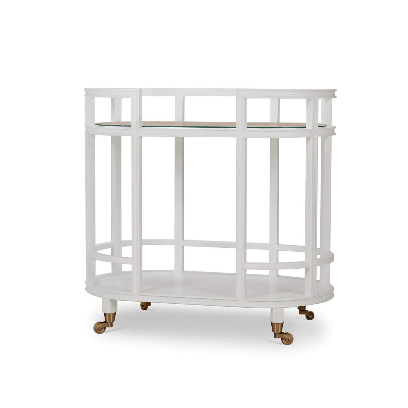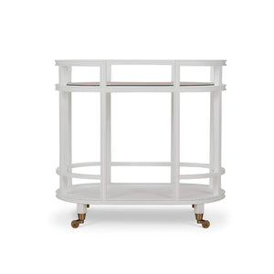 The White Painted Coastal Style Bar Cart brings a relaxed, elegant look with its open design and crisp true white painted finish. Made from mahogany, its oval shape and rounded frame give it a light, welcoming feel. The glass top shelf adds openness and reflects light, highlighting the cart’s clean, coastal style.