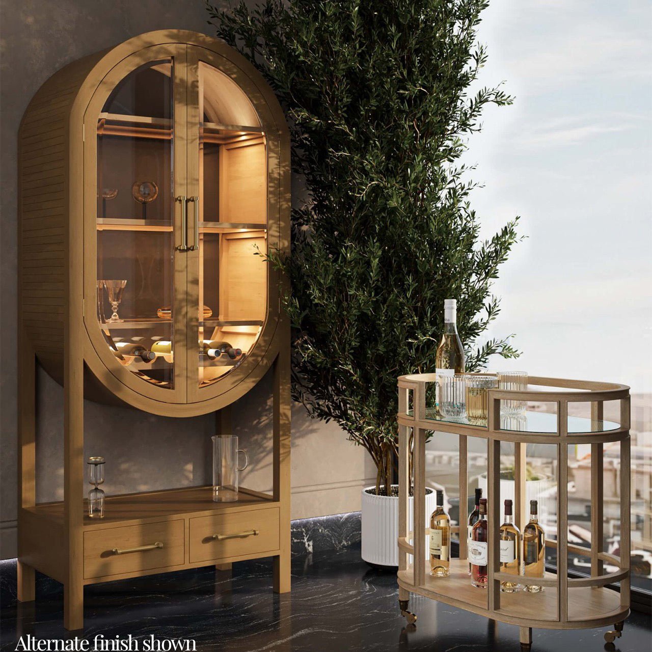 The lower wooden shelf provides space for bottles and other entertaining essentials. Brass-finished caster wheels add a vintage touch and make the cart easy to move. With a mix of modern lines and a hint of Art Deco style, this bar cart works well for both casual gatherings and more polished spaces. Its natural colors and balanced design fit perfectly in coastal, California casual, or contemporary homes.