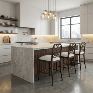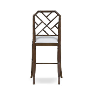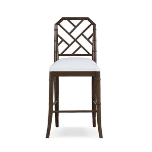 The Chinese Chippendale Counter Stool presents a timeless interpretation of classic Chinoiserie design, defined by its geometric fretwork back and sculptural faux bamboo frame. The rich, dark walnut finish on the mahogany frame creates depth and contrast, while the crisp Arctic white performance fabric upholstered seat introduces a refined, modern balance that keeps the silhouette feeling fresh and versatile.