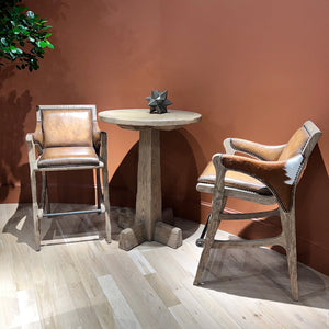 The Rustic Western Leather & Hide Bar Stool offers a fresh take on Western Ranch Revival style by combining rugged charm with skilled craftsmanship. Its solid wood frame has a warm, faded oak finish, and the gently curved legs and arms give the stool a softer look while keeping its classic, heritage feel.
