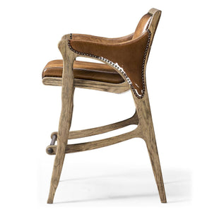 The seat and back are covered in hand-stained leather, finished with classic nailhead trim along the edges for a neat, natural look. Hair-on-hide panels on the outer arms add texture and true Western style, so each stool is unique. The forged metal footrest makes the chair sturdy and comfortable, making it a great choice for kitchen islands, bars, or lodge-style spaces.