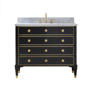 Elevate your bathroom with the Neo Classic Black Marble Top Vanity, a statement of refined sophistication. Designed for those with an eye for luxury, this vanity blends classic European elegance with modern functionality. The ebony-painted finish is accentuated by solid brass trim, evoking a timeless aesthetic. A pristine White Carrara Marble countertop with natural veining provides a striking contrast, offering both durability and opulence.