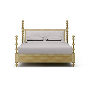 The upholstered headboard in Arctic White performance fabric provides a soft contrast to the natural wood grain, while the paneled footboard adds structure and symmetry. Elegant yet relaxed, this design offers a graceful focal point for both traditional and transitional interiors.