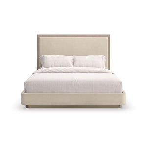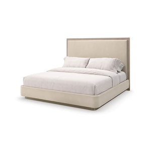 Classic Modern Upholstered King Bed, a storied collective of material and form, this classic bed introduces a calming neutral palette that is warm and inviting. Framed in Koto veneers with a subtle Chevron pattern inspired by early Greek motifs, its parsons-style headboard is dressed in a wool-like flannel that is soft yet durable and capped on all three sides in glinting Brushed Gold metal.