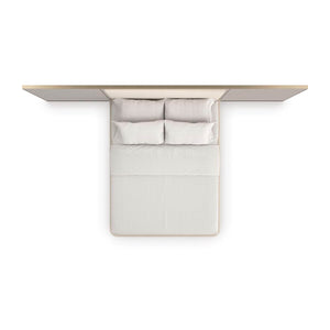 Seemingly floating on a Brushed Gold plinth base, its sophisticated silhouette brings effortless elegance to bedroom interiors and guest suites. Also available with paneled, chevron-patterned headboard wings for added drama.
