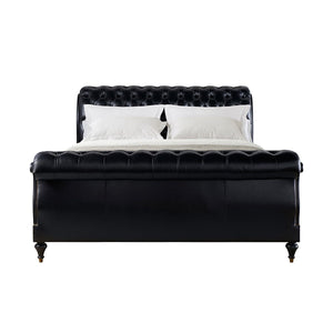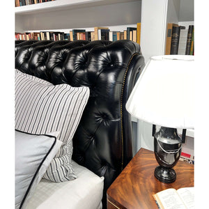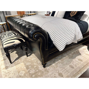 This stunning bed is upholstered in black leather, offering a smooth, sophisticated feel. The elegant tufted design on the headboard and footboard adds a classic touch, while the French Natural finish nailhead trim provides a hint of vintage refinement.