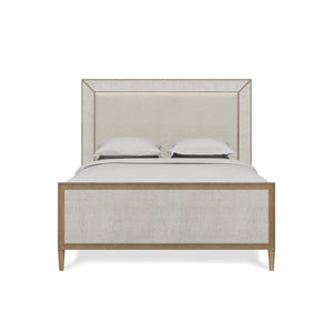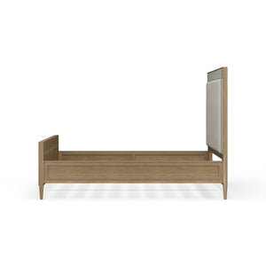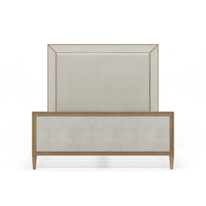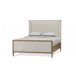 With a mahogany frame in our light sandbar finish, with a headboard inset with Dinara natural performance fabric. The headboard and footboard are framed with white rattan caning.