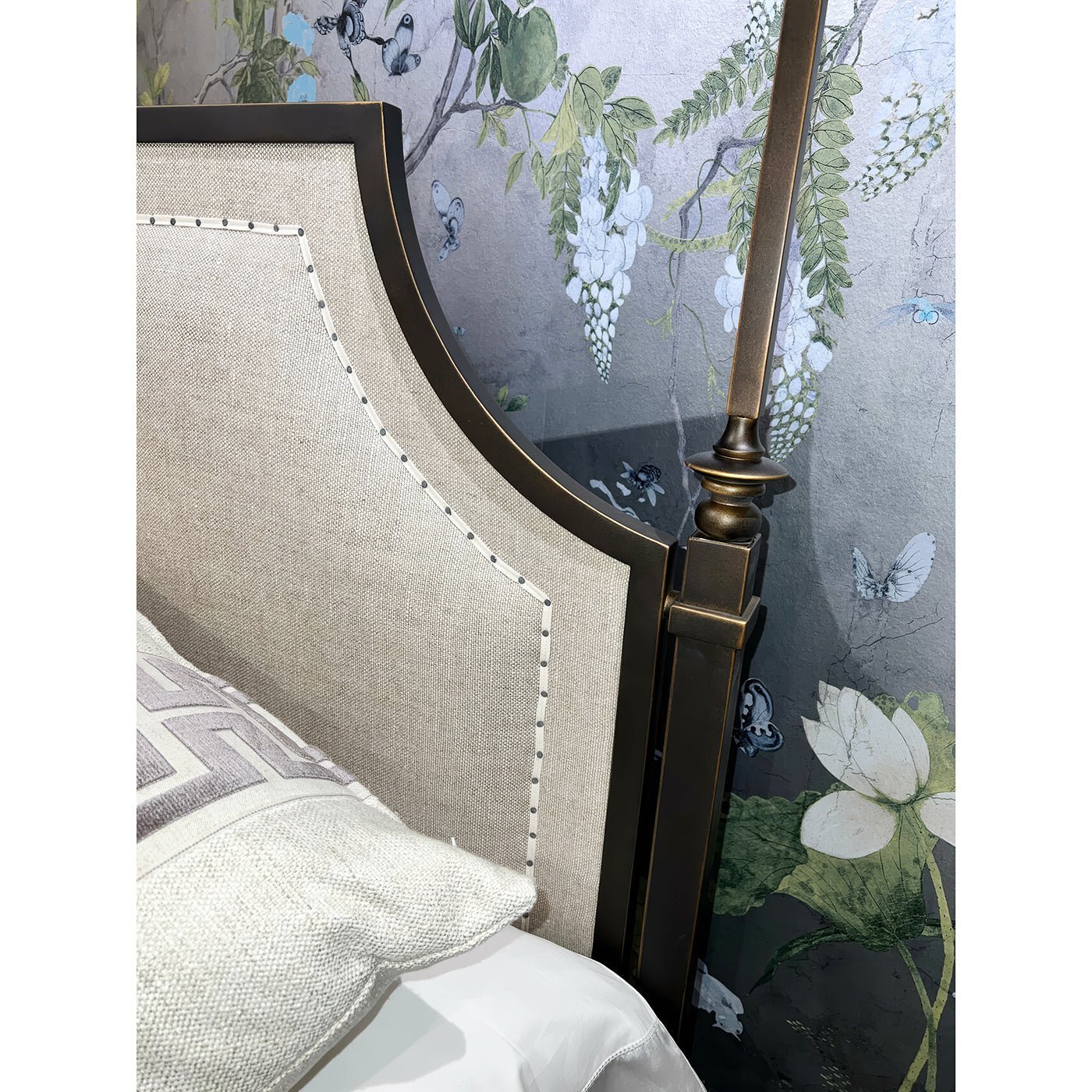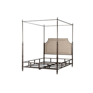 With its stunning bronze finish metal canopy frame, topped with finials, a padded upholstered headboard, and square tapered legs, it adds a touch of elegance and sophistication to any bedroom.