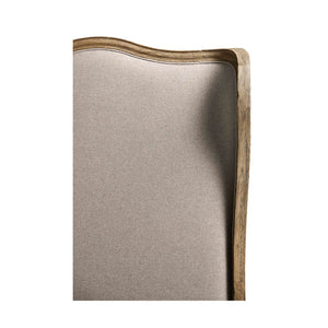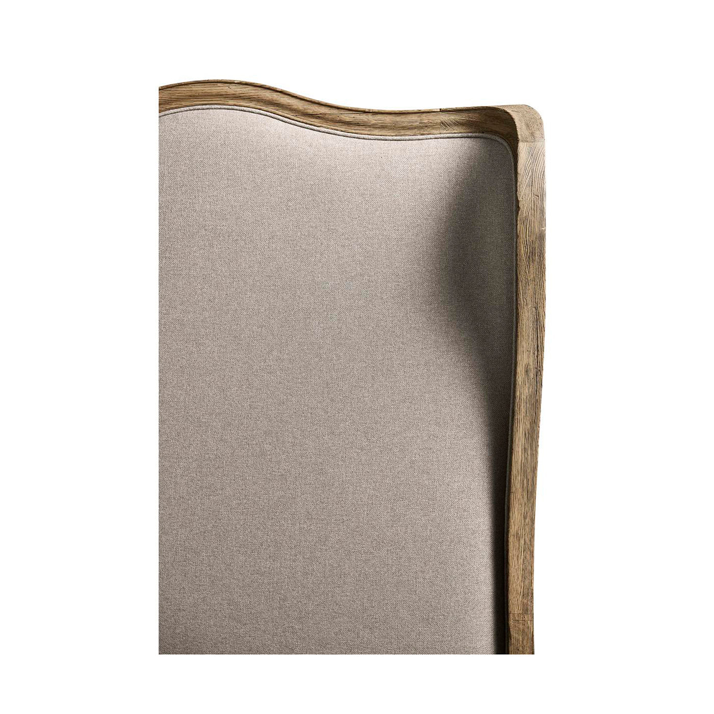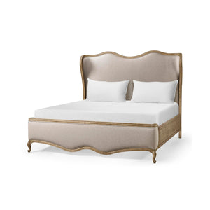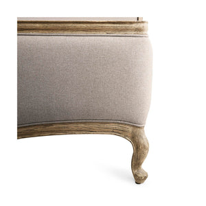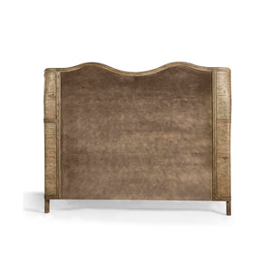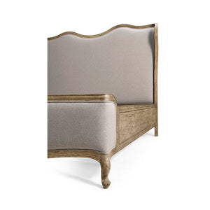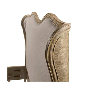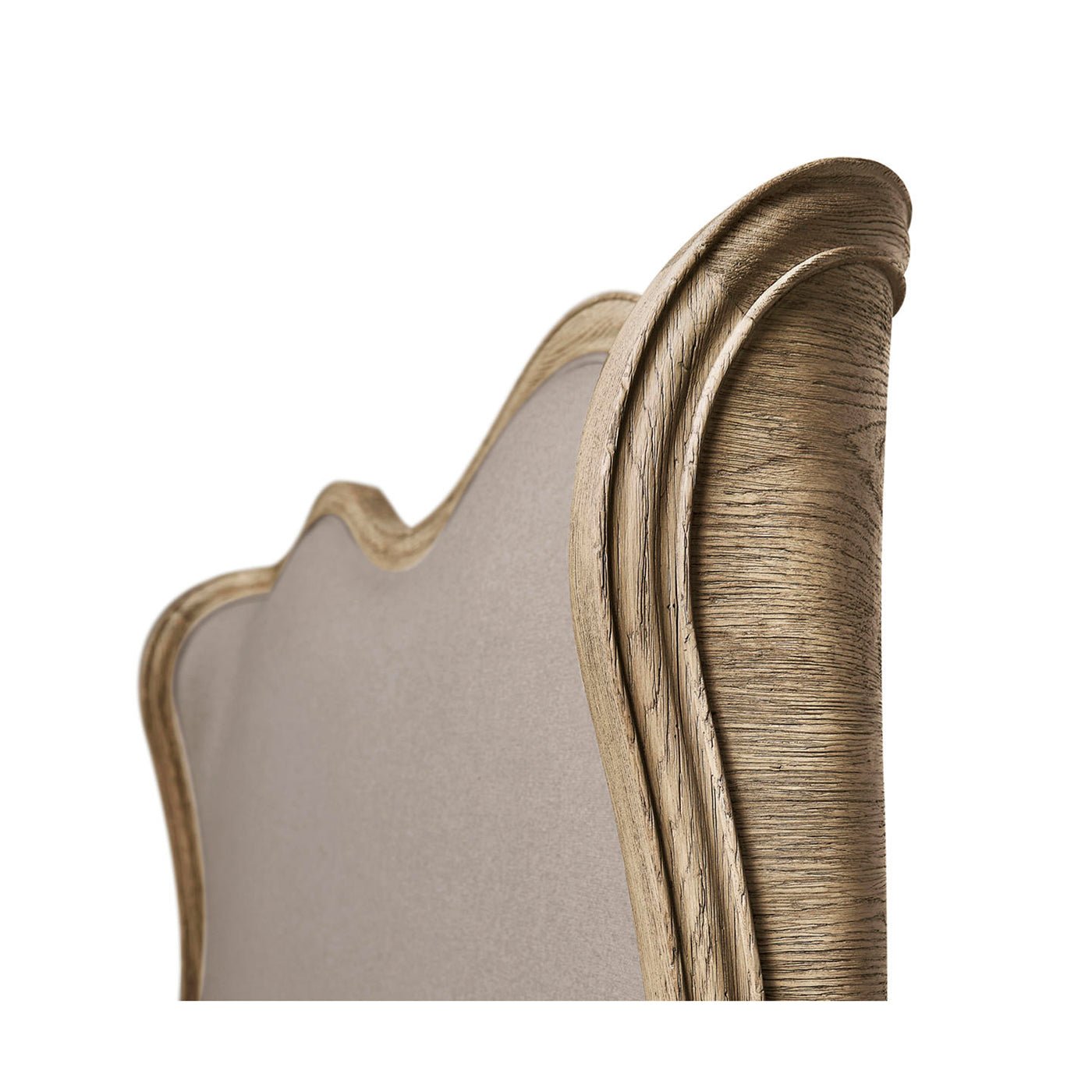 The French Provincial Upholstered Oak Bed - Cal King combines classic European style with modern comfort. Its oak frame has a rich, faded finish that shows off the beauty of antique-inspired woodwork, adding warmth and texture to your bedroom. The headboard and footboard are gently sculpted and covered in a neutral fabric, which contrasts nicely with the wood and adds both comfort and a soft look.