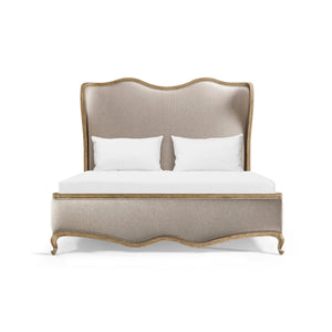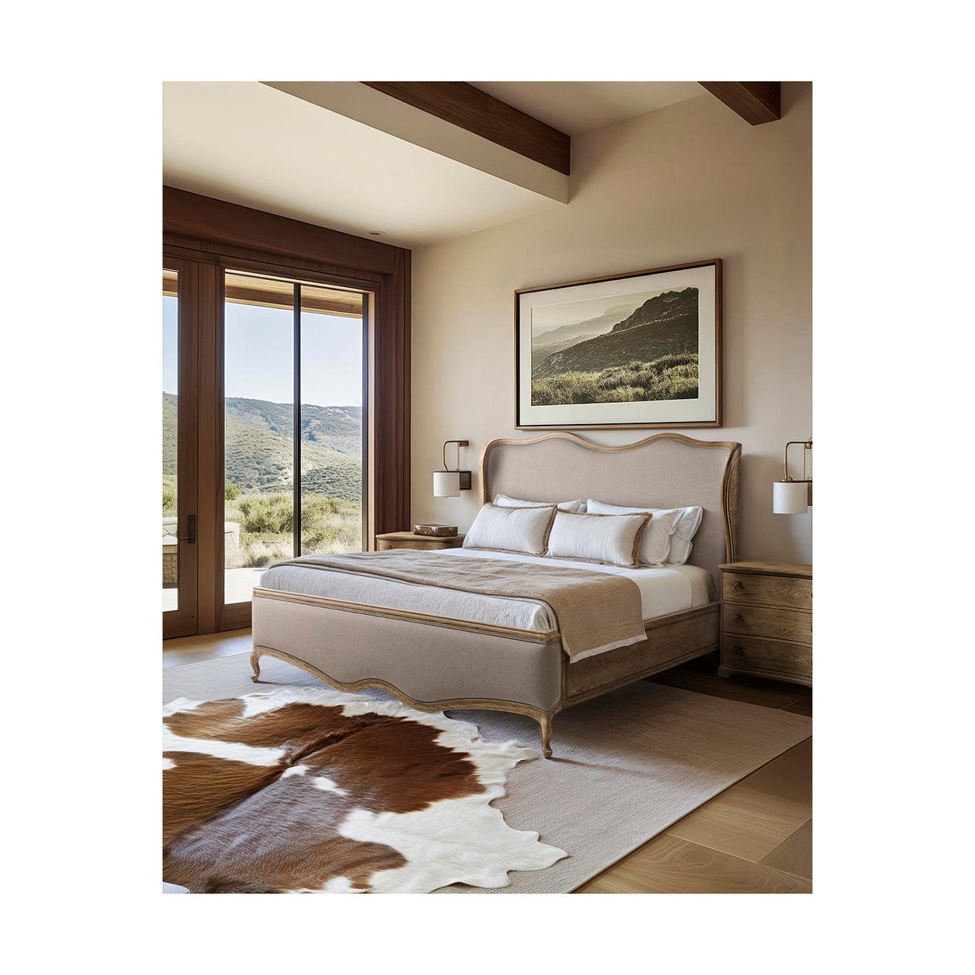 This bed takes its inspiration from Louis XV French Provincial design, with a curved silhouette, smooth edges, and graceful cabriole-style legs. The mix of rustic wood and tailored upholstery gives it a timeless look that fits well in traditional, cottage, or modern spaces. It is made to be a calm centerpiece, offering lasting style with a comfortable, relaxed feel.