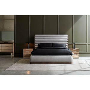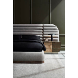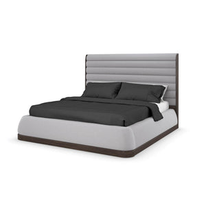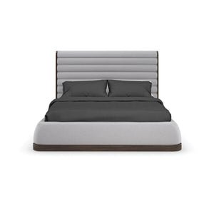 Gray Channeled King Bed, architectural by design, yet soft around the edges, this channel-tufted bed makes a dramatic impact in a pebble gray billiard cloth fabric. Clean lines are accentuated by Sepia trim, warmly framing the headboard and surrounding platform base.