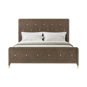 The dramatic headboard and footboard showcase a geometric diamond veneer pattern, accented with delicate inlays that reflect subtle brilliance. Framed in a rich Mink brown finish, its sculpted corners and brass-capped feet enhance the sense of tailored glamour, perfectly suited for both transitional and contemporary interiors.