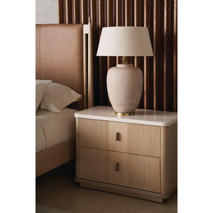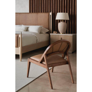 Mid Century Leather Queen Bed, with simple modern lines and a rich use of material, the bed brings a simple yet sophisticated cadence to bedroom interiors. Tailored in a lavish, camel-colored leather, its clean, parsons-style headboard warmly complements a Sun Drenched Oak wood frame. Metal finials in a Lucent Bronze finish accentuate subtly tapered posts with a note of luxe.