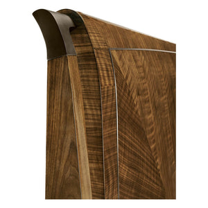 Introducing the Mid Century Style Quartered Walnut King Size Bed - a statement piece of unparalleled elegance and luxury, crafted from the finest quality walnut wood, featuring a lustrous antiqued brass trim, hardware, and feet that add a touch of opulence to its sophisticated design.