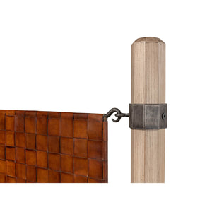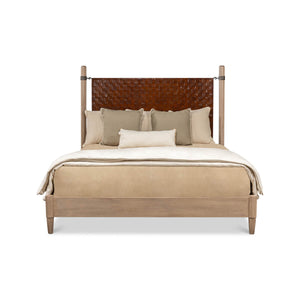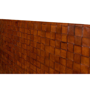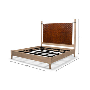 The King Size Modern Industrial Bed is a beautiful piece of furniture that features a headboard made of hand-woven brown leather. The leather is meticulously woven by skilled artisans, creating a stunning and unique texture that adds both visual interest and tactile appeal to the bed.