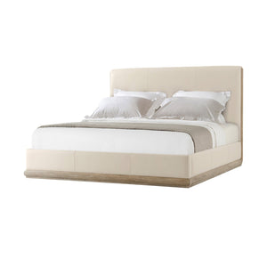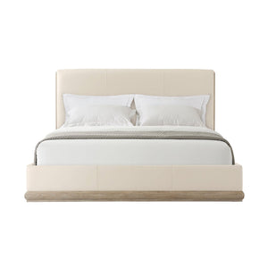 Modern Light Oak and Leather Upholstered Bed, nestled in an exposed wood base while the headboard and bottom rails are neatly upholstered. With a light grey oak finished frame, clean lines, soft corners, and a neutral finish, we invite you for a good night’s sleep.