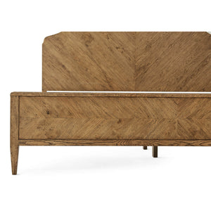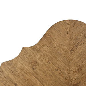 A modern rustic oak king bed with an arched headboard. This artfully crafted bed has been hand-veneered. It has been crafted with rustic oak and is shown in our striking Dawn finish.
