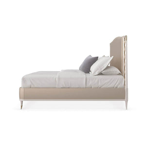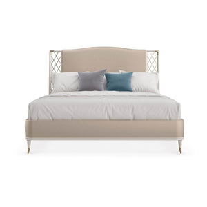 Trellis Modern King Bed, this upholstered bed features an ornate metal trellis with starry details. Dressed in a shimmering silver vinyl that’s easy to keep looking pristine, the subtly curved headboard, foot and side rails are beautifully balanced by a wood frame and tapered feet in a pearlescent Stardust finish. Metal ferrules in a Whisper of Gold add a luxe note.