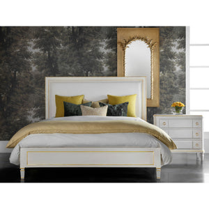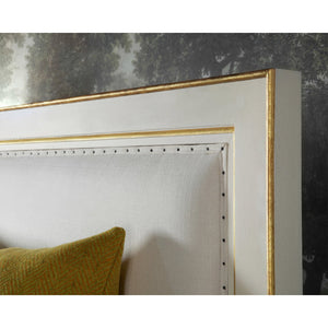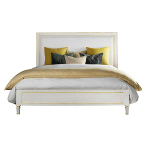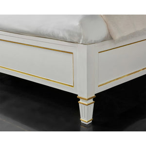 Indulge in the elegance of Swedish Neo-Classical design with the White Painted King Platform Bed. Featuring a performance white linen upholstered headboard framed by an antique white-painted finish with gold-painted accents. The paneled rails and square tapered, and fluted legs pay homage to Gustavian style, bringing a refined and stately charm to any bedroom.