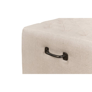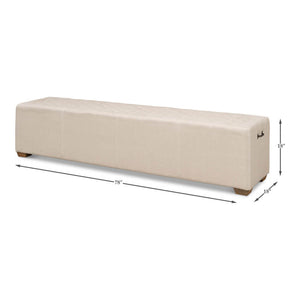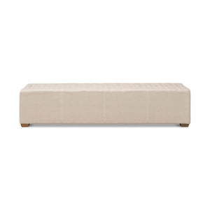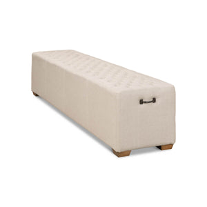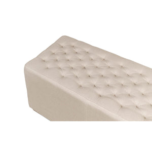 Modern tufted linen bench, the long tufted bench in natural beige linen, with American oak feet and brass traditional handle hardware.