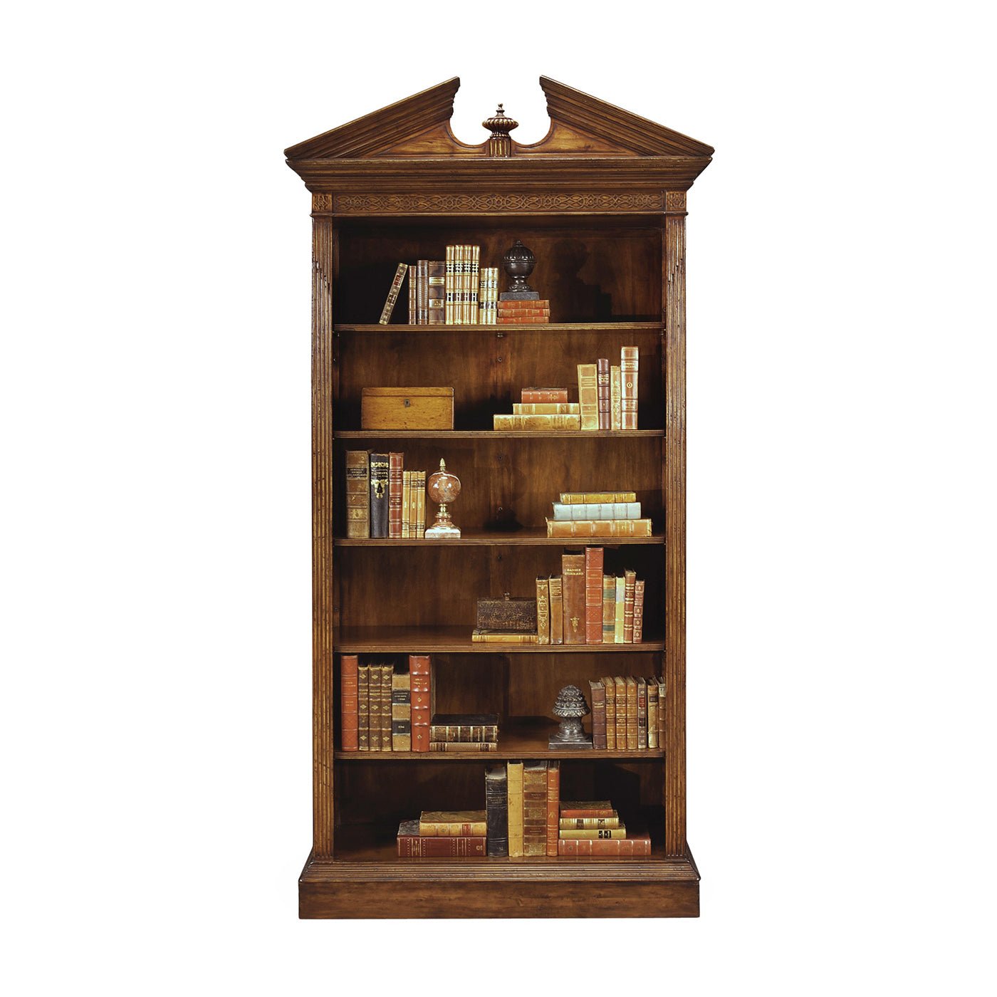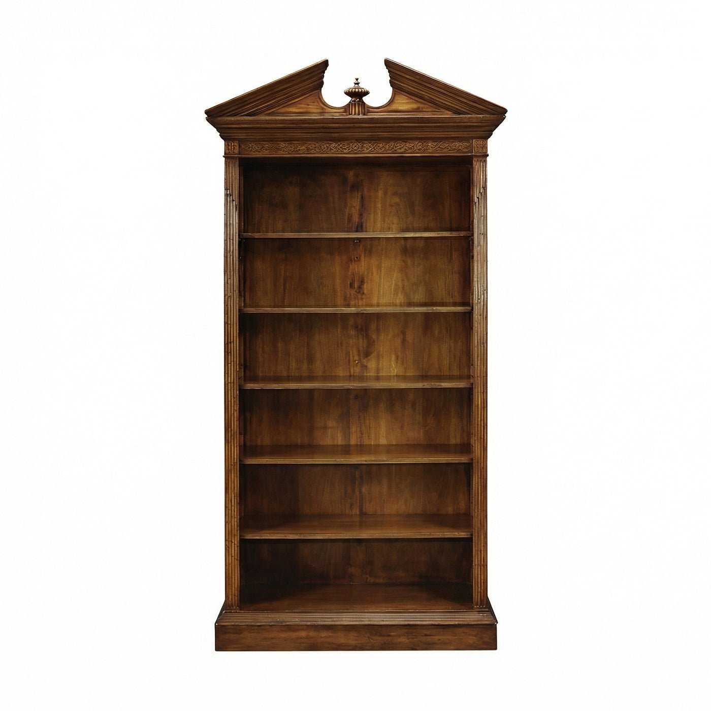 The George II Walnut Architectural Open Bookcase stands out with its classic proportions, symmetry, and elegant architectural details. Made from richly toned wood, this tall bookcase features blind fret carving, fluted pilasters and a broken pediment with a central urn finial, inspired by English Neoclassical and Palladian styles.