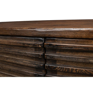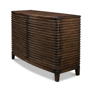 Modern ribbed bowfront cabinet credenza, with reclaimed pine, this curbed front door cabinet has a wonderful patina and antiqued finish and will fit well within any decor. With a removable interior shelf, and raised on tapered legs.