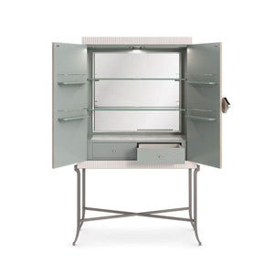 Adding to its lustrous Moonstone finish, gold hardware with a cracked acrylic inset lends a sparkling focal feature. Its pale blue painted interior features LED lighting with a touch dimmer, a mirrored back panel, and ample storage for entertaining essentials. A scratch- and stain-resistant stone surface allows you to mix cocktails and mocktails worry-free.