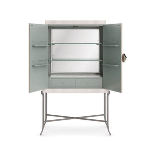 Contemporary Bar Cabinet, radiating beauty, both inside and out, this bar cabinet makes an alluring addition to living and dining interiors. Balanced on a slender metal frame, it features tall doors exquisitely crafted in Koto veneers to create a romantic rosette pattern, artfully accentuated by a beaded wood detail in Pearly White paint.