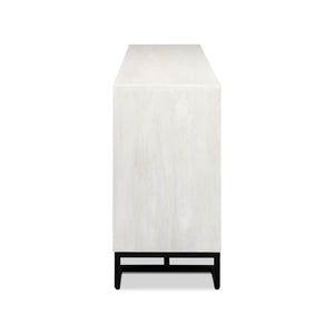 The contrast of the black geometric door panels to the off-white structure adds a modern, high-contrast aesthetic to any living space. Resting on a minimalist metal base, the clean lines ensure it doesn't overwhelm but rather complements your existing decor.