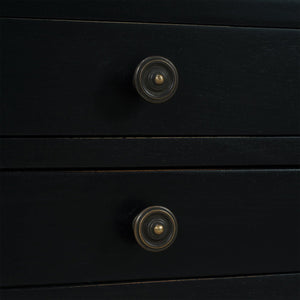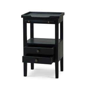 A pull-out shelf adds character and functionality. Made of solid mahogany with a pair of dovetailed drawers that create a lower shelf for an elegant display. The gorgeous Batavia Black finish adds a sophisticated and serene touch that complements any decor style.