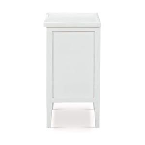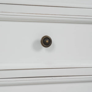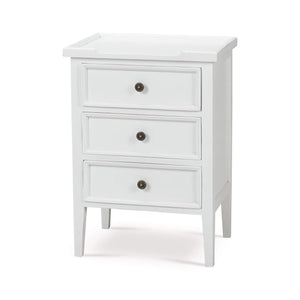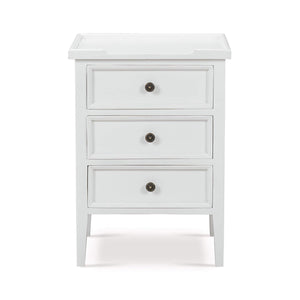 Crafted with meticulous attention to detail, this end table features a raised edge gallery top, perfect for keeping your items secure. Made of solid mahogany with three drawers. The lightly distressed architectural white finish adds a sophisticated and serene touch that complements any decor style.