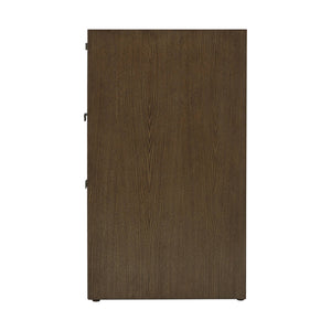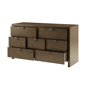 Dark Ash Long Dresser, a sleek seven-drawer dresser made of figured cathedral ash in a dark Earth finish with textured metal pulls in our Ember finish and soft close drawers.